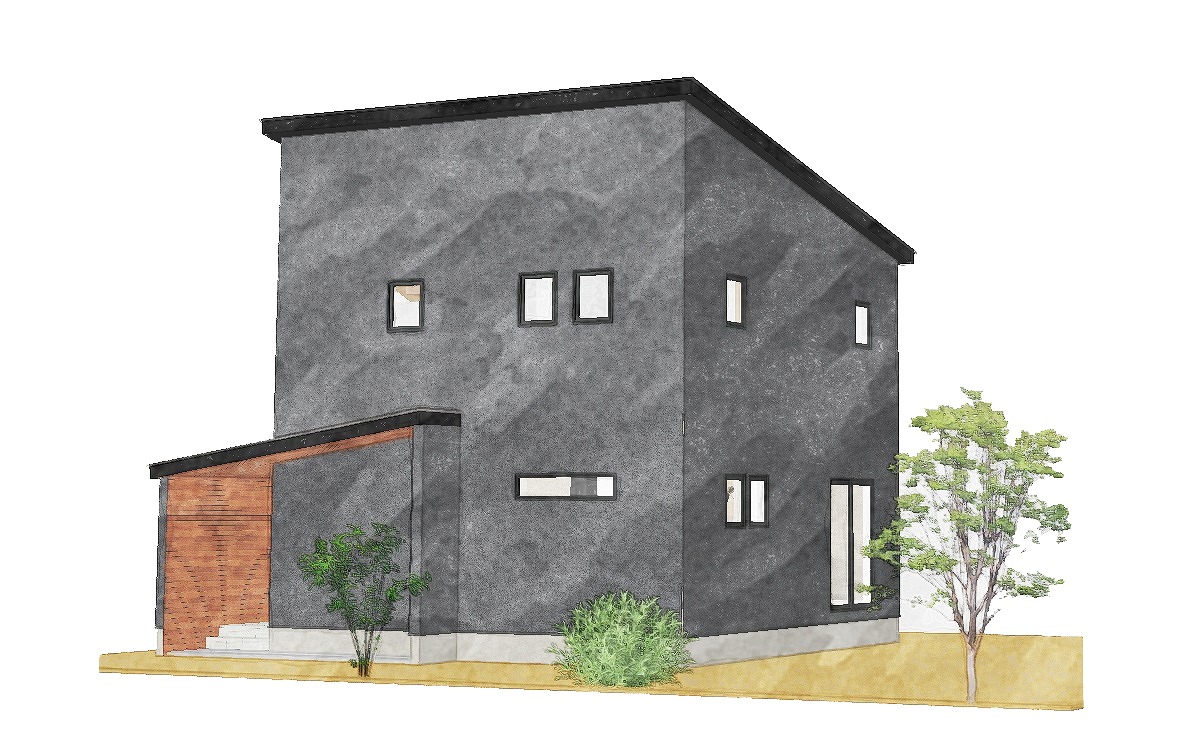 ダークな塗り壁に玄関周りにはレッドシダーな板張り。
