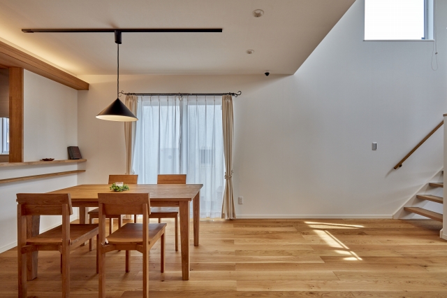 大きさ35坪ながら吹抜け等により狭さを感じない開放的な空間となっています。