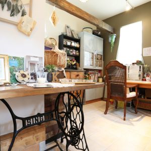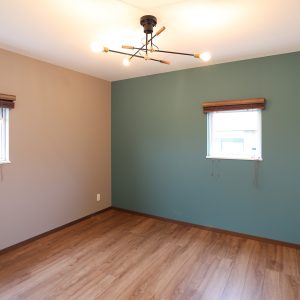 奥を一面、モスグリーンに。アンティークな家具や雑貨と相性ばっちりです!