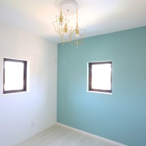ティファニーブルーがまぶしい子供室。かわいい印象ですが、意外とシャビーな家具も似合いますよ。