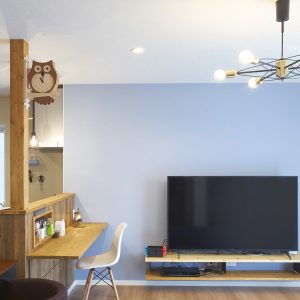 リビング一面、ブルーでコーディネート。北欧インテリアを感じさせる空間に。