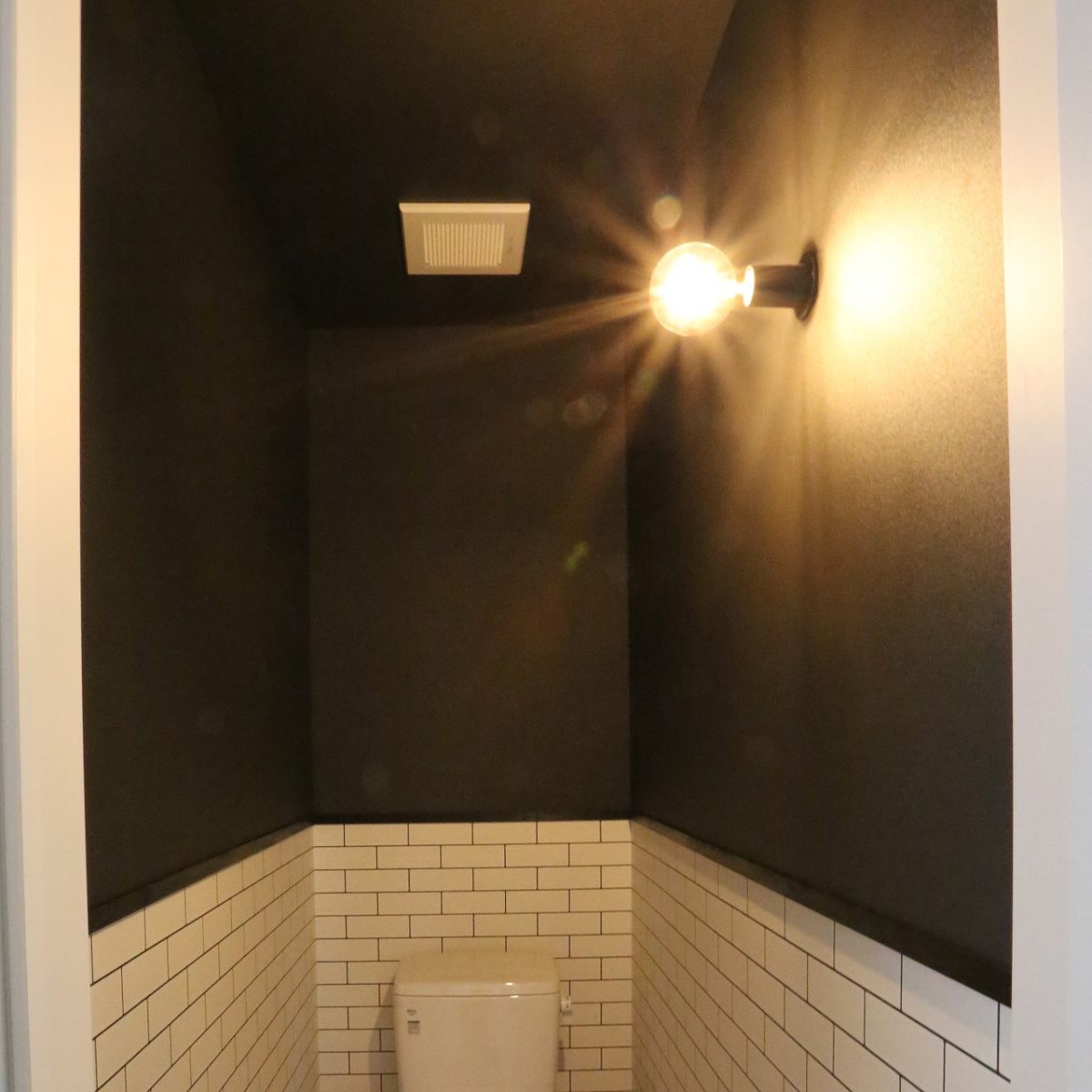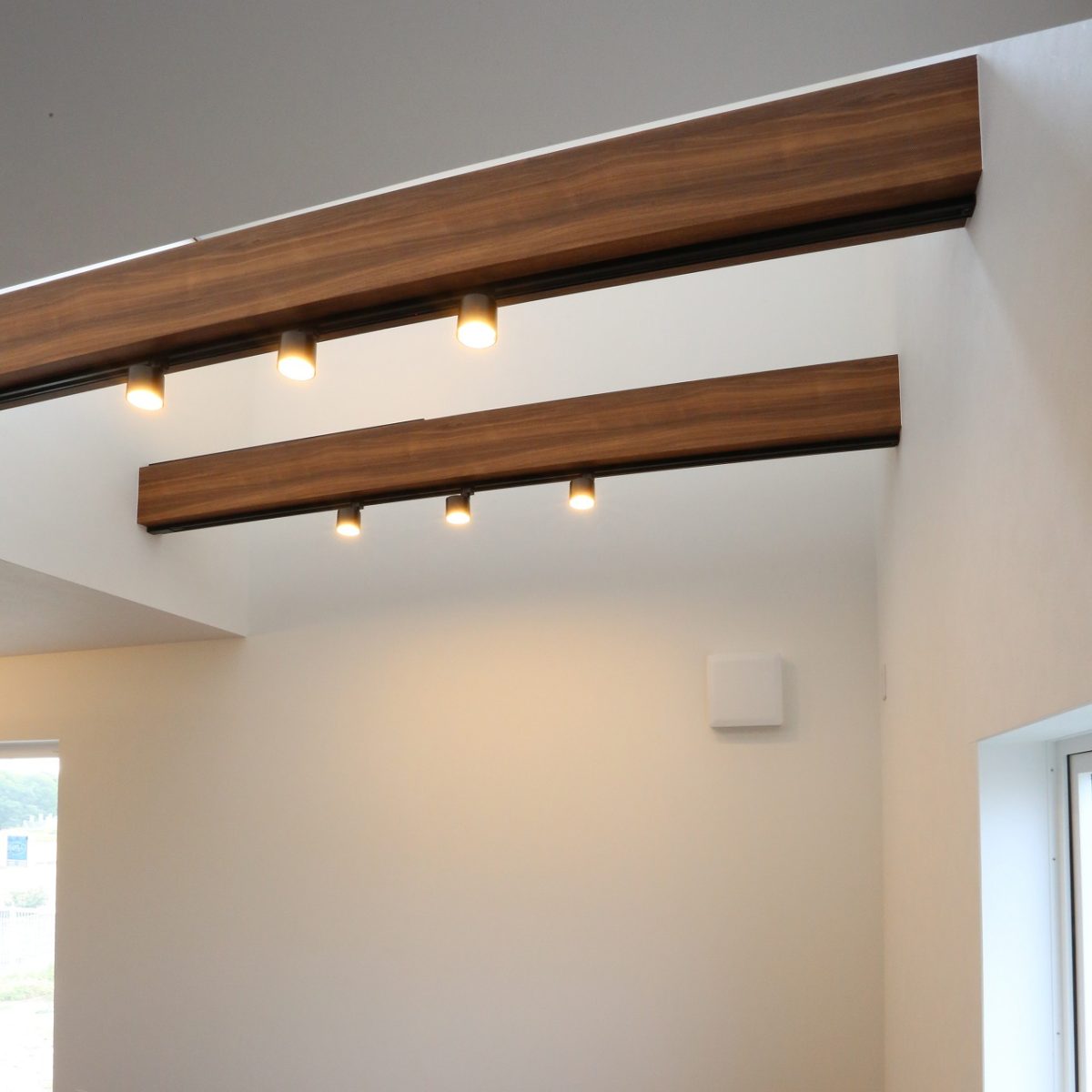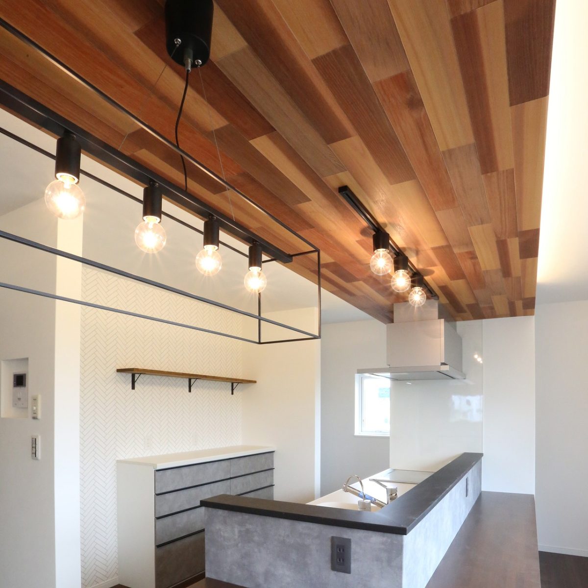 木目調の下がり天井には間接照明を入れ、黒やグレーでまとめています。