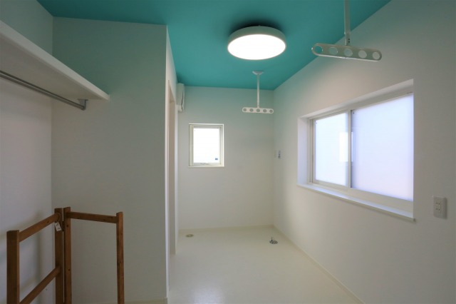LDK以外の脱衣室兼サンルームは脱衣室、サンルームといったように個別で分けず、1つの空間としてまとめました。パイプもつけて、洗濯・干す・収納が1つの空間で完結できるので家事効率はめちゃくちゃ良いです。
