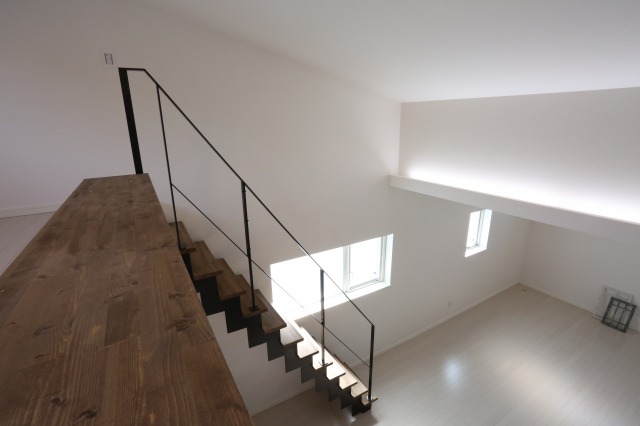 ロフトへ上がる階段もお施主様と打合せしてオーダーメイドで作ったアイアンになります。またロフトに作ったカウンターは、お施主様からロフトから足を出して座ったときに丁度良い高さが良いという希望から打合せの時に実際にその場で座ってもらったりして細かく高さを考えて造作したものになります。