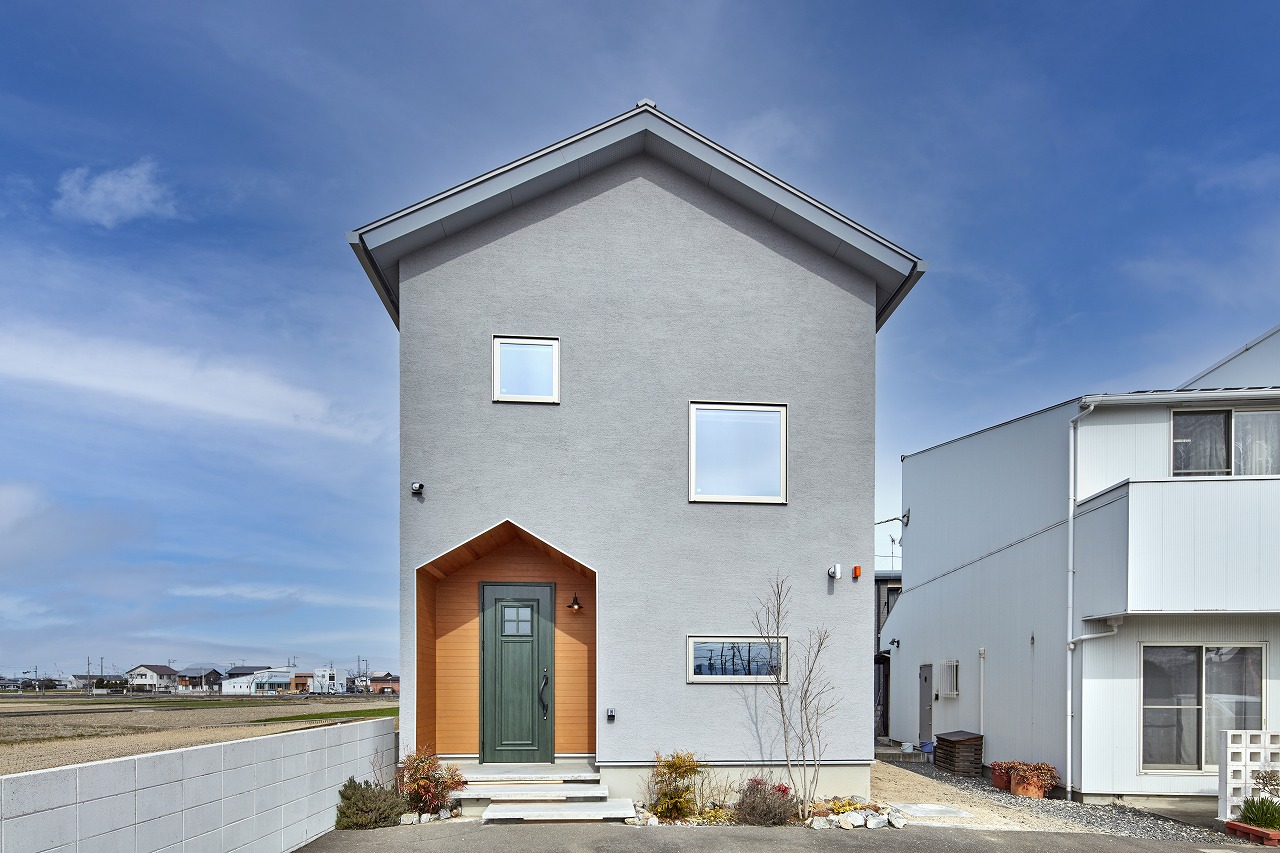 <淡いグレーが目を惹く三角屋根の外観>