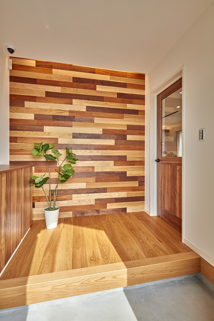 <ランダムに施した板張りの玄関>